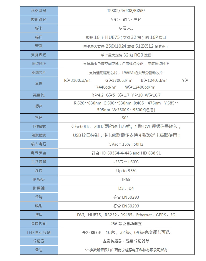 | 備注 | *本參數解釋權歸廣西南寧桂強電子科技有限公司所有 |