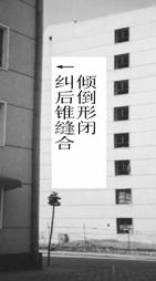 采用掏土灌水法設計施工的該項工程,糾傾工作共進行了2個月。各觀測點傾斜值全部已回至規范要求范圍,內外縱墻原有裂縫大部分已閉合。從糾傾前照片可以看出,傾斜樓房山墻與鄰近參照建筑物墻體間在垂直方向上形成了上寬下窄的倒錐形縫,糾傾后建筑物與參照建筑物間的倒錐形縫已閉合(圖2)。