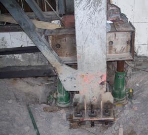 由于礦井凍結(jié)法施工造成后期井口附房產(chǎn)生較大沉降,影響了上部結(jié)構(gòu)的使用。采用頂升法對鋼結(jié)構(gòu)廠房中的沉降較大的鋼柱進(jìn)行糾偏,該方面需要在鋼柱腹板上焊接鋼牛腿提供頂升支點,同時對鋼柱底部預(yù)埋的螺栓桿體加長,每個鋼柱兩側(cè)設(shè)置兩個頂升千斤頂,經(jīng)過頂升糾偏后該鋼結(jié)構(gòu)廠房基本恢復(fù)原狀。