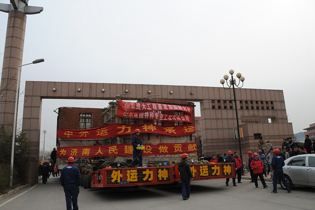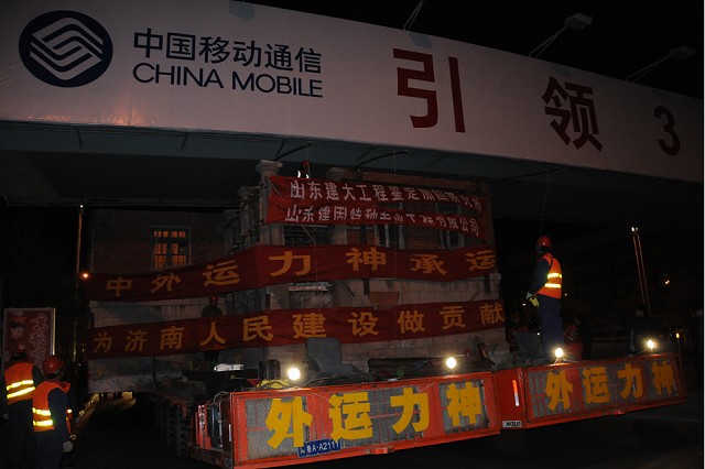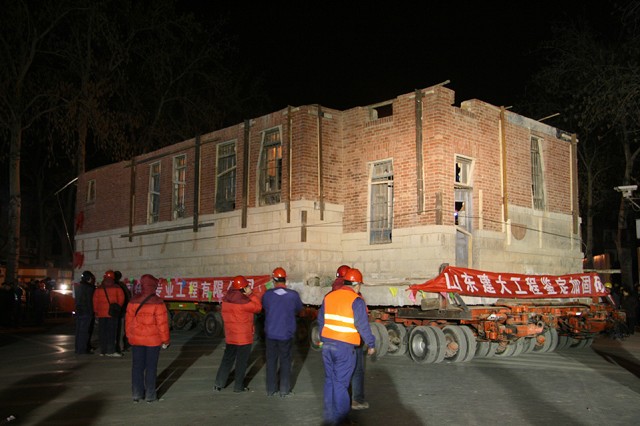 該建筑原位于繁華市區,為了盡量減輕道路交通壓力, 對運輸線路進行了詳細勘察,遷移于3月1日21:38分開始,遷移過程中,老別墅四次屈身過街天橋,三過立交,于3月2日11:43安全到達山東建筑大學新校區。整個遷移過程歷時14小時,遷移距離為30公里。